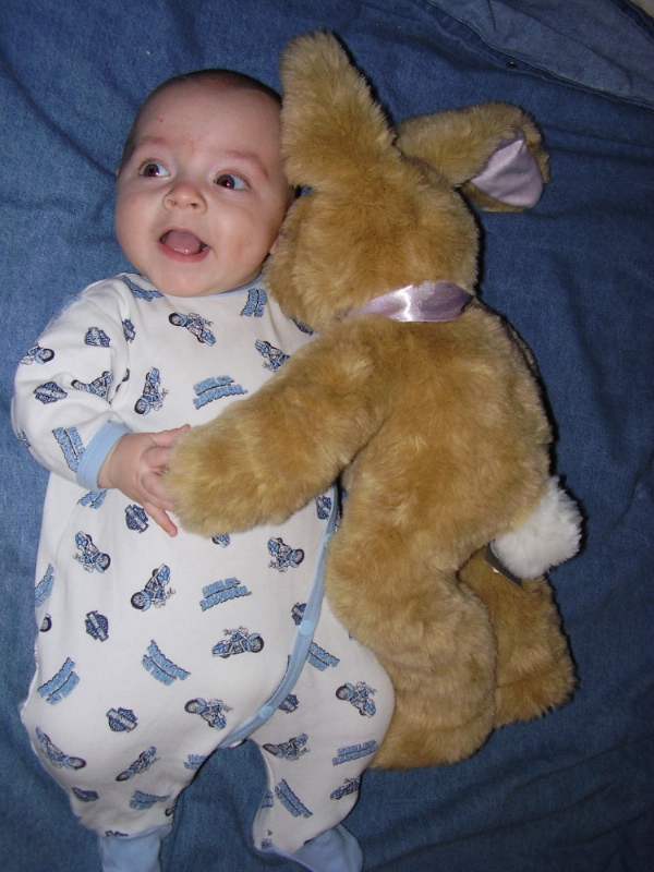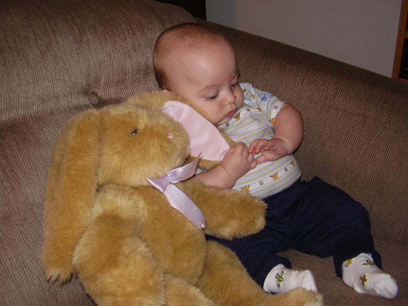 Auntie Roo, Liam's fairy godmother, gave him a magician bunny toy (usually referred to as the Magic Rabbit). For the time being, it's Liam's size: he can cuddle it, sit with it, wrestle with it, and he loves it.