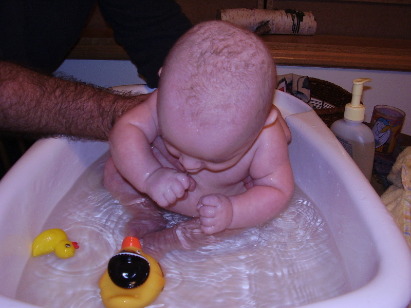 In the weeks following his fifth month birthday, Liam got better and better at sitting up. Bath time suddenly became a lot more fun. The rubber ducks given to him by his Nana, his Auntie Ceri, and his Uncle Scott certainly were more entertaining when he could see them!