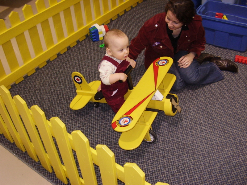 At Easter, Liam got to visit his Grandad's Canadian Warcraft Heritage Museum, and he got to fly one of the planes! Well, in the play area, anyhow. He was absolutely delighted with the ride-on biplane: he could sit on the seat and move his feet, and the plane rolled forward and backward. This was the first kind of ride-on toy he'd ever tried, and it was a huge hit.