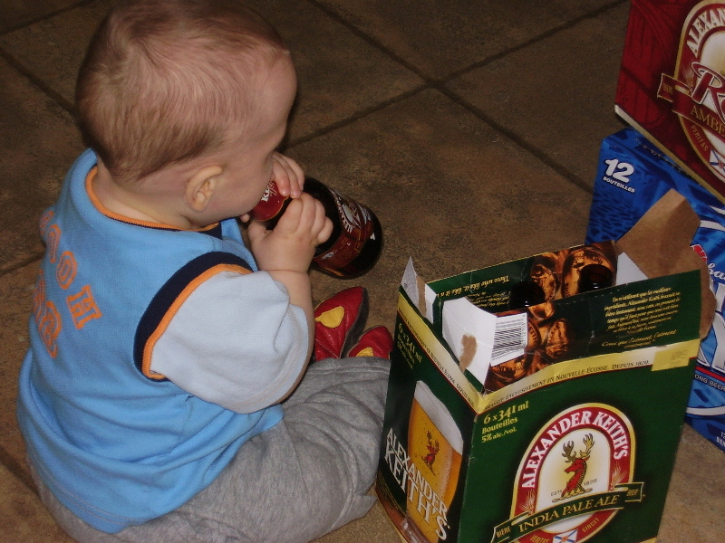 Liam was most upset about missing his Uncle Tass and Auntie Jan's getting-married party. He made up for it the next morning by going through all the boxes of empties.