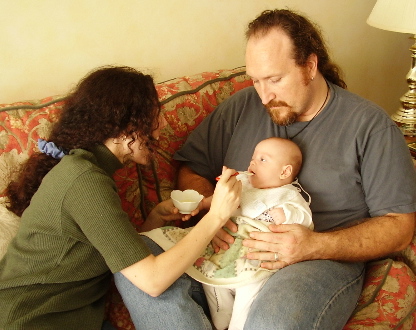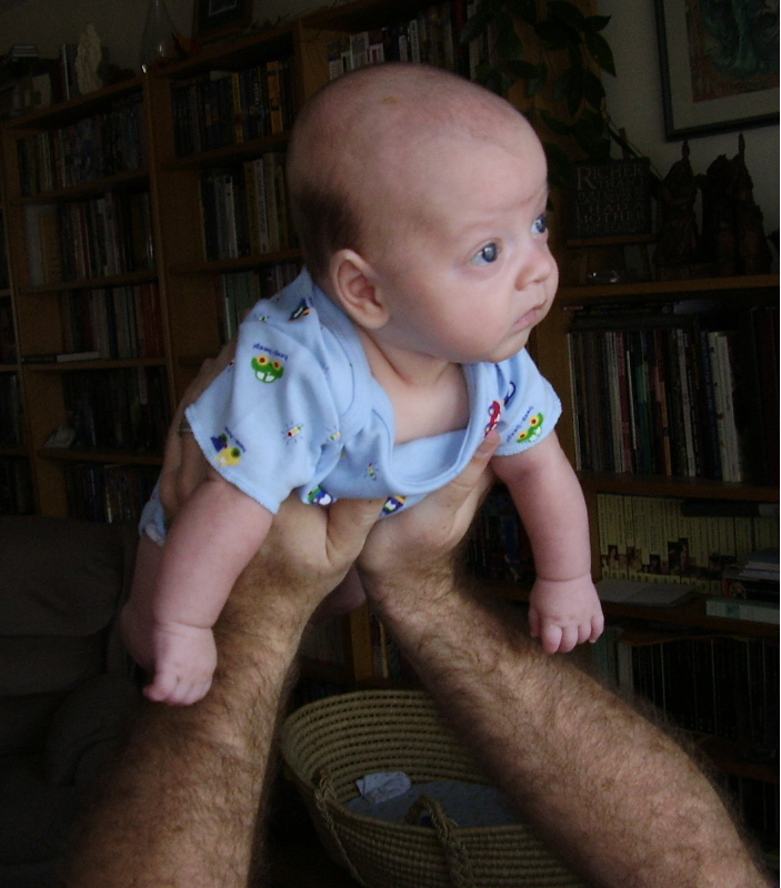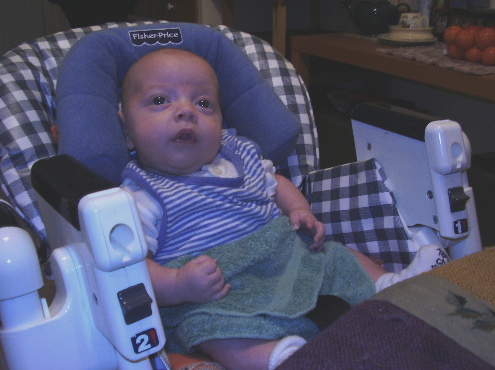 Photo Album: Liam: Three Months ![]() Because Liam is such a social creature, by three months he was insistent about sitting with us at the dinner table. When holding him on our laps became a bit too difficult (asking your spouse to cut up your meat eventually gets annoying), we borrowed a high chair three months ahead of our projected schedule. It was one of the best things we could have done. He was a bit small for it, but with a folded towel underneath him and an infant head brace tucked behind him to help keep him upright, Liam was nice and cosy. ![]() We travelled to Oakville to visit my parents again at Thanksgiving. Liam's interest in staring at people eating had turned into a full-out obsession by this point, and that fact coupled with his need to constantly be nursing finally led us to giving him a taste of rice cereal just a few days before his fourth month birthday. After the initial reaction of "What on earth are you doing to me?" the first time he tried it, he seemed to enjoy it immensely. Food for Liam was a social thing at this point: sitting with the grownups at the table, and eating things like they eat with utensils and everything. We weren't looking to wean him; solids were in no way replacing breastfeeding. ![]() A cuddle with his Granddad. ![]() Liam wasn't a bad traveller by car at this age, so long as we stopped every two hours for a meal and a stretch. ![]() Handsome flying baby! < Back to the main Liam Page > On to the Liam: Four Months Old photo album < Back to the Liam: One and Two Months Old photo album This material (c) A. Murphy-Hiscock