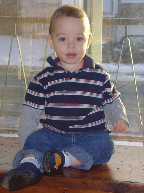 Liam’s latest trick is to climb on the cedar chest to sit in front of window and watch the world go by. He has extrapolated this ability to climb on kitchen chairs, the coffee table, and anything else he can hoist himself up onto. He managed to climb up onto his tiny child-sized chair the other day and stand up on it, so when I walked back into the livng room with his cup he was standing almost two feet taller than usual, which made for a double-take on my part. The next day HRH sawed two inches off the legs so that the chair would be more stable, because yikes, it was ungood the way it was: fine for sitting (although the seat was too high for him to use without climbing up on it first then turning around — it’s much easier now), but certainly not for standing.