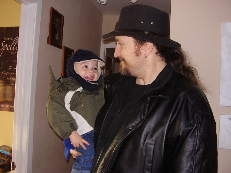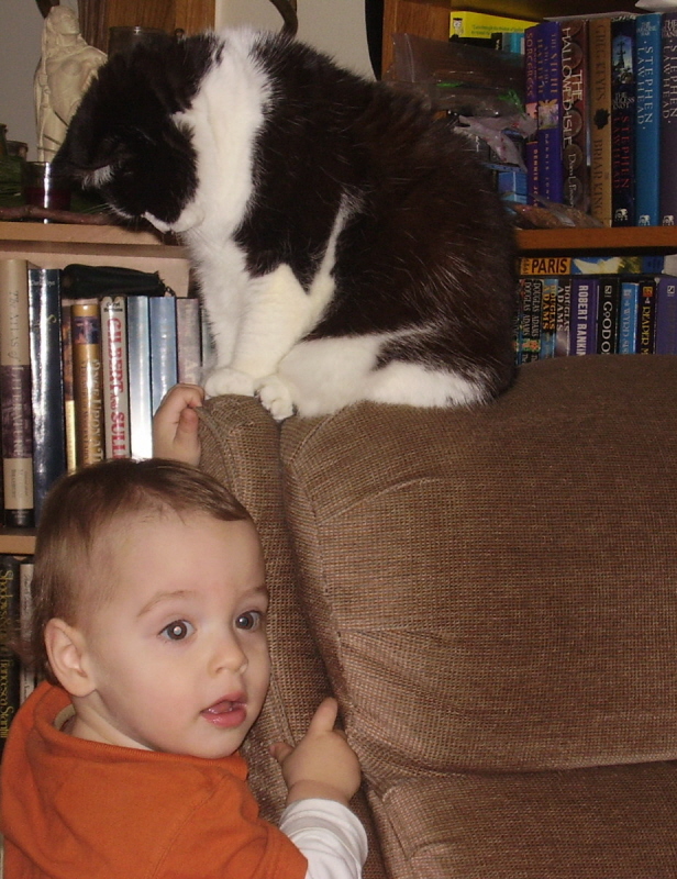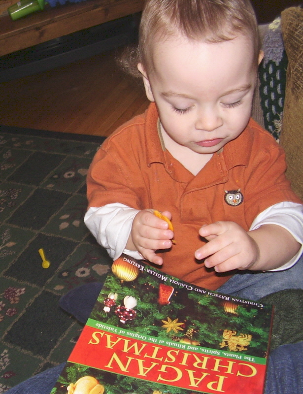 I finally got around to doing reconstructive surgery on his first copy of the Goodnight Moon board book he had loved into several pieces, and after gluing and taping and pressing it I slipped it back into his crib. When HRH put him down that night he rolled over and saw it, reached for it with a contented sigh, snuggled into it, and fell asleep. His current favourite book (out of the crib, that is) is the My First Touch and Feel Christmas book I picked up for him at a discount place. That’s how he learned to say ‘angel’ and ‘snowman’, and refined his Santa-identification skills. When he’d prefer to watch a movie he asks for ‘Turtle?’, which means Baby Neptune from the Baby Einstein series, which is all about water in different forms. Turtles are a big thing right now in Liam’s world, but nothing will replace Boo the (real) rabbit at daycare who lets Liam alone hug and kiss him, and who will follow him around. (Let me tell you, our cats could learn a thing or two from Boo: if you don’t run, Liam doesn’t grab you by the tail to haul you back so that he can kiss you. Seriously, cats. He stays gentle if you don’t freak out when you see him coming.)