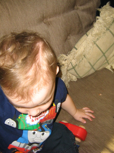 When he was fractious last week we sat him down to watch the beginning of the first Harry Potter film to take his mind off his teeth, and while the owls were interesting and the Hogwarts Express was thrilling, they were nowhere near as exciting as Madam Hooch’s class. “Broom!” he said, very excited. “Yes,” we said, “brooms.” And he ran off to get his little broom, brought it back into the living room, and went right up to the television and held it up across the screen. “Broom! Up!” he said, very pleased. And then his eyes nearly fell out of his head when those broomsticks flew. “Broom! Fly! Sky!” he said, racing back to me on the chesterfield, turning to lean his back against me and breathlessly take it all in. We caught him trying to walk with his broom between his legs later. The only show he watches with regularity now is Zoboomafoo, which he loves. (The TV is now turned off after Zoboo and before Thomas because of the new morning schedule, which is just fine with me as I have seen enough of the island of Sodor to last me a good long time.)