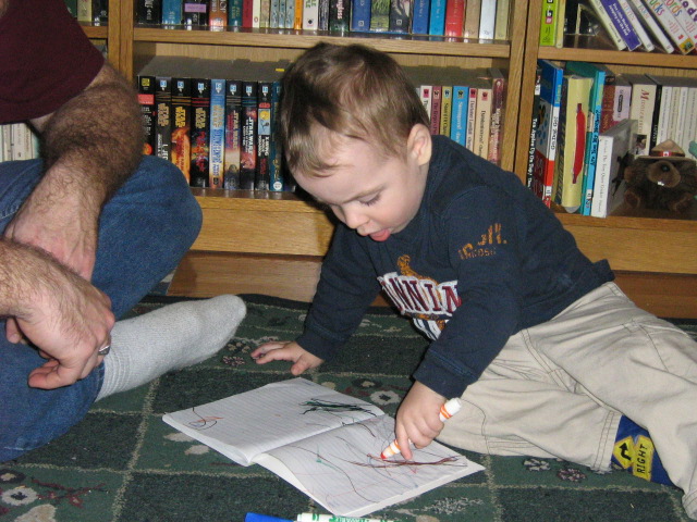 He’s really passionate about drawing (which, like his love for books, comes as no surprise, I’m sure). He has a thick little copybook in which he draws with his markers, and I love that we’ll be able to keep this book and look back at it. It has a photo of Sesame Street characters on the front, so when he wants to draw he runs to the shelf and says, “Ernie, Ernie, Ernie.” These days he’s very excited about trees: he draws them on his own, and asks HRH and I to draw tree outlines for him to colour in. Naming the colours is coming along too. Cool colours tend to default to ‘green’, though, and warm colours default to ‘yellow’, although just to keep things fresh he throws ‘purple’ and ‘blue’ and ‘brown’ in at random times. We tried to bring the crayons out again, but with his need to gnaw on things to ease the pressure of his molars it was still a no-go. That’s fine; the markers are great, so long as he doesn’t bite the thick tips off, and he likes taking breaks every ten minutes or so to wash his hands clean of the ink.