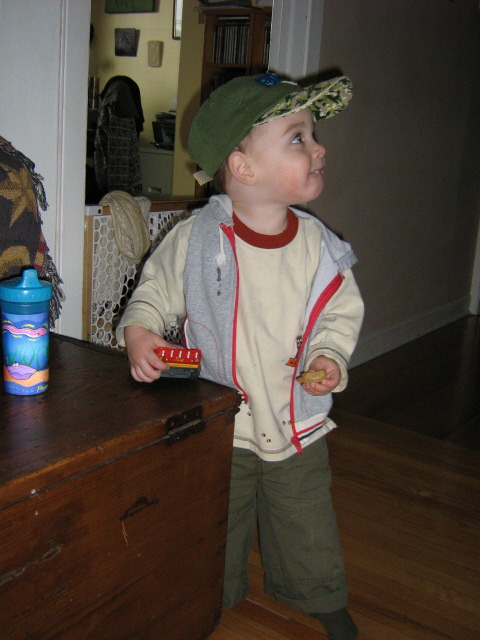 He gallops through the house chanting his name over and over, throwing “Me!” into the mix every now and again. When he looks in the mirror after a bath he says, “Me! Liam!” and sounds very satisfied about it. And he’s already developing an amusing method of deflection. “Liam, are you dong [insert questionable activity in which he’s not supposed to engage here, such as climbing on the couch or touching the earth in the plants]?” we’ll say. “No,” he’ll say casually, and turn to look at a cat.