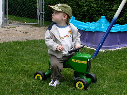 Last week I walked in after his nap and found him standing up, both hands on the top rail, and one foot hooked over the edge. He looked at me; I looked at him. “Up,” he said. It would seem that the notion of climbing out has now occurred to him. It hasn’t happened in actuality, but we’re preparing for the transition to the bed just in case it has to happen sooner than we think. We’ve got the bed rails; the bedding is en route. A couple of weeks ago he climbed up into his bay window and sat there, too. He’ll try to climb just about anything. Also, he does not walk; he runs. The swings no longer make him nervous (and I still have no idea what happened to change his joy in swinging to anxiety; no one does).