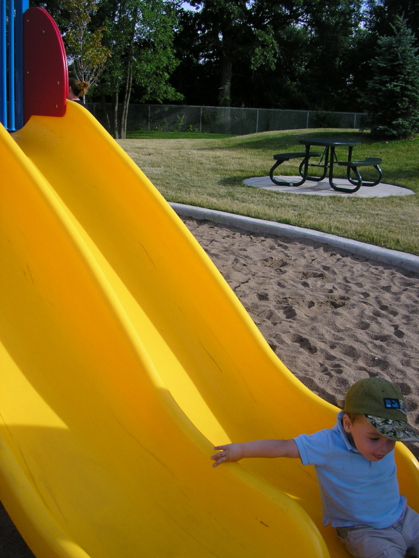 Playground visits consists of climbing stairs, sliding down the slide, running around to climb up and slide down, repeat ad nauseum. Every once in a while he tests physics by trying to climb the slide. “Would you like to play on the swings?” we ask. “No!” he pants as he runs by with a grin on his face. Why? There’s a slide right here. It might as well be the only piece of playground equipment that exists in Liam’s world. He even said “Excuse me” to a girl who was in the way by the stairs last weekend. He plays Ring Around the Rosy too, often by himself. He is particularly fond of the “Ashes, ashes, all fall — down!” bit, doing deep knee bends followed by throwing himself flat on his stomach. His songs are becoming clearer and clearer.