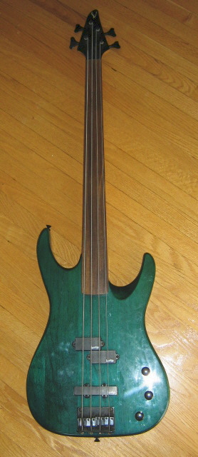 She is a Vantage fretless bass, model number 330b (we think), with a lovely grained rosewood fingerboard, satin-finished neck, and a deep emerald-green stained body. She hasn’t told me her name yet, although I suspect one. She’s about ten years old but has only been played a handful of times, and never gigged, so she is in almost original condition. The jack is a bit finicky and she needs a tune-up, but that’s standard maintenance.
