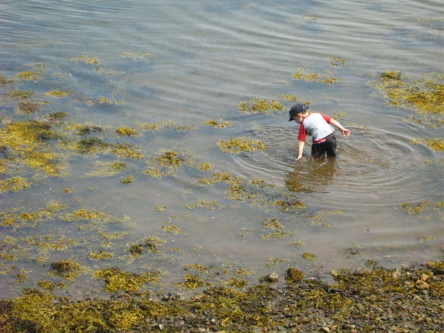 We drove to Mahone Bay the next day and got there around 3:30. My mother had called while we were on the road and said that all the cousins were down and there would be fifteen people for dinner at the cottage that night. I said, “Um, sure.” (My mother was also down on vacation, staying with my aunt.) When we arrived the cottage was empty, thank goodness, and so HRH unloaded while I took the boy right down to the ocean. We took off our shoes and without any hesitation he waded right in and kept going, soaking his clothes. We leaned over and dipped our fingers in and then touched them to our tongues, and he paused for a moment and said critically, “Not bad… I like it!” (We’d already warned him about not drinking it, but tasting was important.) The air was so fresh.