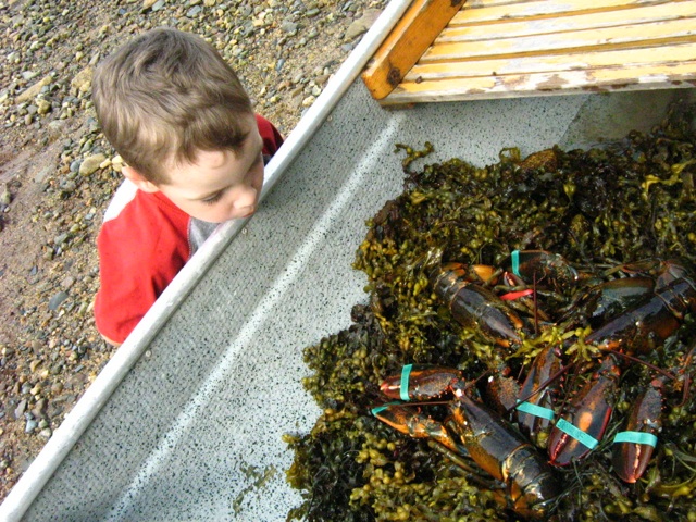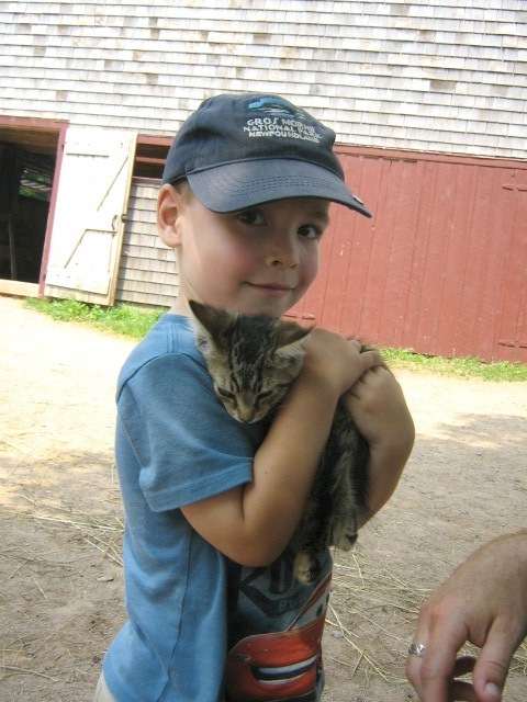 Wednesday we went to Ross Farm, a place I’d visited often as a child. The biggest attraction for the boy was the litter of barn kittens who were pouncing around, although he did climb on the fence to talk to the horse, talked to the chickens for a while, ran around the barn with the carriages and wagons with interest, and showed me a spinning wheel in the main house with great enthusiasm. That night we had my mother over for dinner, and we prepped and ate five pounds of mussels and six pounds of local lobster. It was delicious, and dirt cheap. The boy was very interested in the lobsters while they were alive and in the process of boiling them on a fire HRH made on the beach, but wasn’t as enthusiastic about eating them. We roasted marshmallows over the coals once the rest of us had eaten our fill, though, and that was very exciting. It was wonderful to have my mother there while we were in Nova Scotia.
