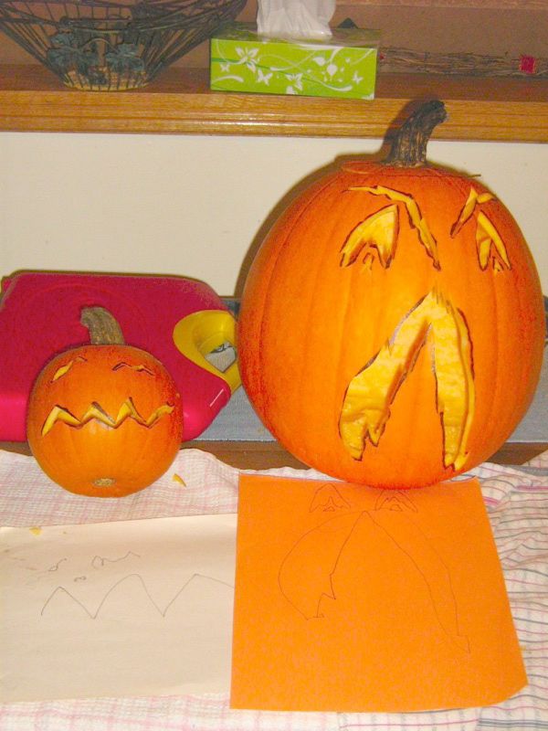 We headed home and it took the boy a while to settle for nap, of course. When he woke up HRH had hollowed out the pumpkins in preparation for carving them, and we got the boy to draw the faces for them. The results were great!