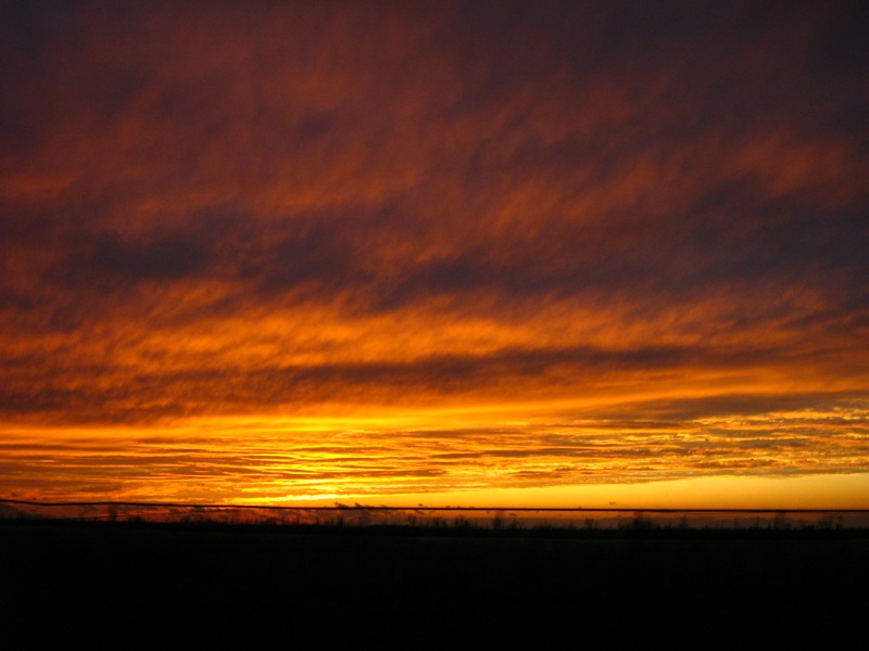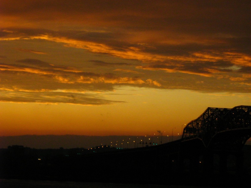 Then we looked in the rearview mirror, and the sky behind us was on fire. Copper and gold and blazing apricot-bronze; absolutely incredible. When we got across the river I rolled down the window again (rather dangerous in the high winds, whoa) and took photos looking back at Montreal: