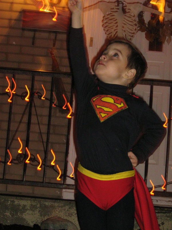 We had to stop for gas in La Prairie, but after that it was relatively smooth sailing, and we got to the boy’s grandparents’ door just before six-thirty. After a quick gulp of alcohol to soothe the stress we’d incurred on the way and much admiring of the decor there we got the boy out the door. He loves dressing up, he loves the decorations, he loves the candy… he is not such a big fan of older kids in scary costumes. In fact, after the first house he started digging his heels in because there were two teenagers right behind us wearing horrific rubber masks whom he saw every time he left a door, and on the corner he stopped and started crying, asking to go back home to Grandma and Papa because he was scared of costumes. The woman in the next house heard him and came out to talk to him, and she jollied him up nicely, getting him to come to her front door to see her decorations, and talking to him about the scary costumes. It turned out she worked at the local elementary school and knew exactly how to handle it. (Another example of how what one’s parents tell you doesn’t count, but hearing the same stuff from a different adult is OK.) The boy left in a much more cheerful mood, and I suspect the woman talked to the teenagers behind us because at the next house they stopped to talk to the boy and lifted their masks so he could see they were just people underneath. He was better then, and got to a whole two more houses before saying he was tired and wanted to go home. So this year he hit a total of five houses, three or four fewer than last year.