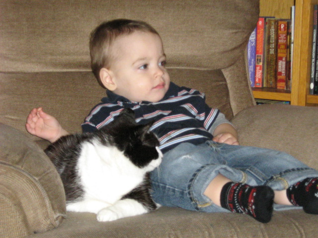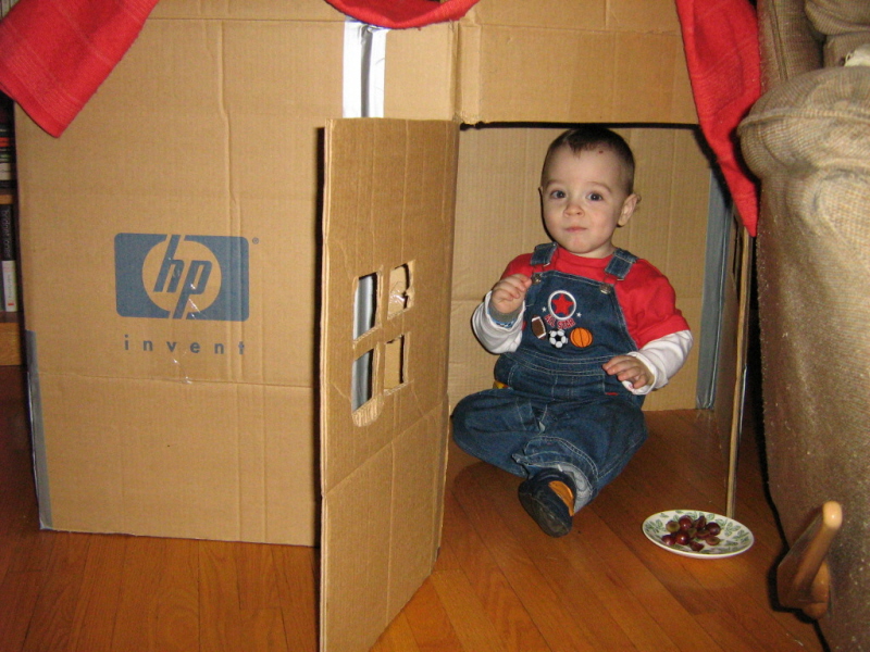 Speaking of cardboard boxes: he is in love with the expanded cardboard box house HRH made for him. It’s getting wobbly because of the beating it’s taking from Liam trying to drag both parents inside at the same time, but it’s well-loved. He throws himself inside it and falls on top of the Thomas pillow that Matthieu, Karine, and Adam gave him for Christmas, and giggles infectiously. Toys collect there. The cats quite like it as well. We tore the house apart looking for Nix the other night, and just as we were giving up we finally caught a glint of light reflecting through the window from two tiny emerald eyes inside the playhouse, where she was perched on the pillow, all tucked up into a little loaf of black cat. Maggie plays with cracker crumbs and random small toys inside it. Cricket has, I think, been traumatized by the episode where Liam found her hiding inside it and tried to tackle her. (Well, everything else inside the playhouse is a toy; why isn’t she?) She shot out through one of the windows and we didn’t see her for the rest of the day.