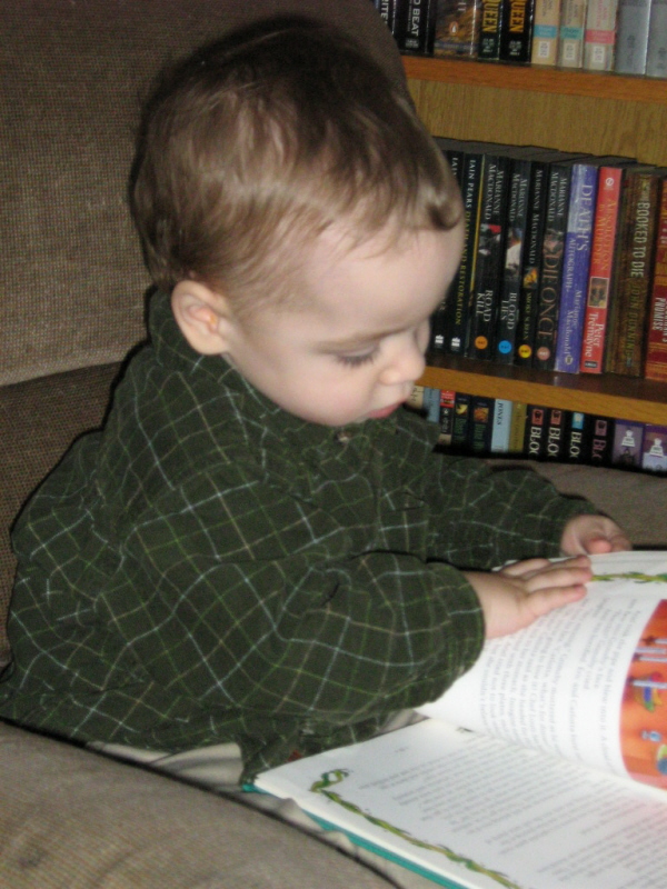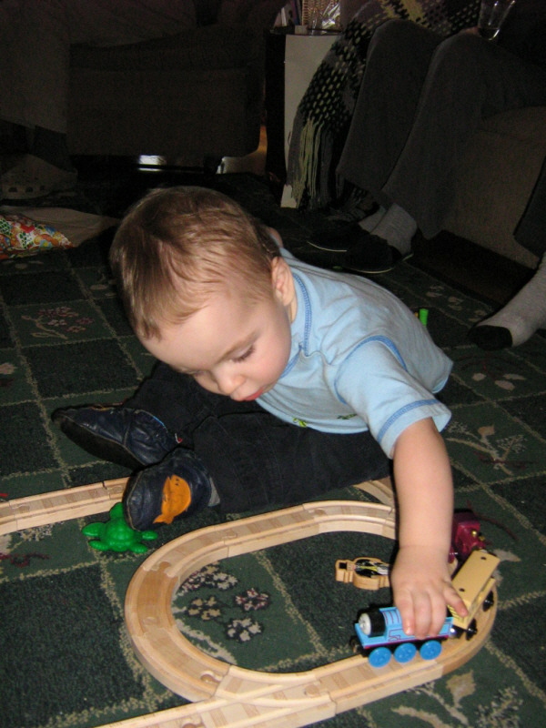 At the doctor’s on Tuesday Liam was measured standing up (tall instead of long!) and weighed on the big people’s scale for the first time. He kept crouching down to put his hand on the dial, saying “Car!” because it looked like an odometer. Yes, Liam goes fast — why walk when you can run? — and grows fast, too: he has hit the 75% percentile in everything and shows no sign in slowing down. He’s 84.5 cm tall, and 13 kg (or 33-something inches and 28 lbs), so anyone who claims that they can actually see him grow from week to week may well not be engaging in hyperbole. Goodness knows that I’ve had to go through his clothes for the second time in a month and remove yet another round of stuff that doesn’t fit, and his pant legs no longer need to be turned up as much. Also, two sets of brand new pyjamas don’t fit properly, one of them a Christmas gift that he just tried on. It’s the tops: size 2 tops in flannel that don’t stretch are just too small to fit over his shoulders and get onto the second arm. (I may cut slits up the sides and hem them, or I may just find him a big floppy t-shirt to wear over the pyjama bottoms and put the tops away.) The fourth and final canine tooth made its appearance around New Year’s Eve, so he’s all on schedule there.