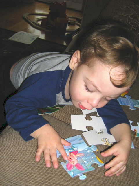 Liam counts things incessantly: orange slices, the ducks in the bath, stairs, chicken nuggets… We’re hearing the use of ‘mine’ and ‘my’ a lot all of a sudden. The need to classify things as belonging to someone has become very important. “That my cat,” he says of Maggie, “that my chair, that my kitchen, that my mama, that my dada; that Mama’s book, that Dada’s boots.” Also frequently heard is the exclamation of “OH NO! ROBOTS!”, which kills me every time, especially when he’s playing with his trains. Evidently robots are the antagonists of choice in Liam’s play world. The other new saying is “Let me be!”, used when we try to get him dressed or up and moving when he’s doing something.