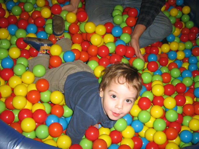 Firsts this month include dinner at an adult friends’ house with no other children, during which he behaved himself well (thank you, Ceri and Scott), and the introduction to the joys of a ball pit (for which we thank you again, ADZO).