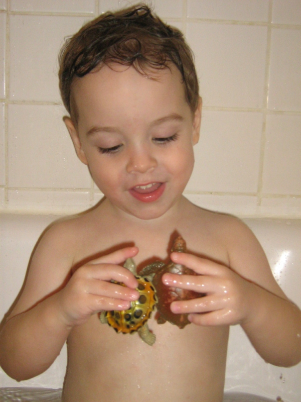 He has recently developed an obsession with being photographed. For example: “Mama, I have a big idea!” he said to me a couple of weeks ago. “You could go get the camera and take pictures of me!” “In your bath?” I said. “You’re offering me free blackmail material to use against you in your teens? I accept. You will regret this.” His caregiver’s webcam fascinates him. He has begun collecting photographs of people he knows, and keeps them in a tidy pile on a bookshelf in the living room. He sits and sorts through them like baseball cards or something. The day we got Gryff, I had to print a photo out for him to take to bed and sleep with.