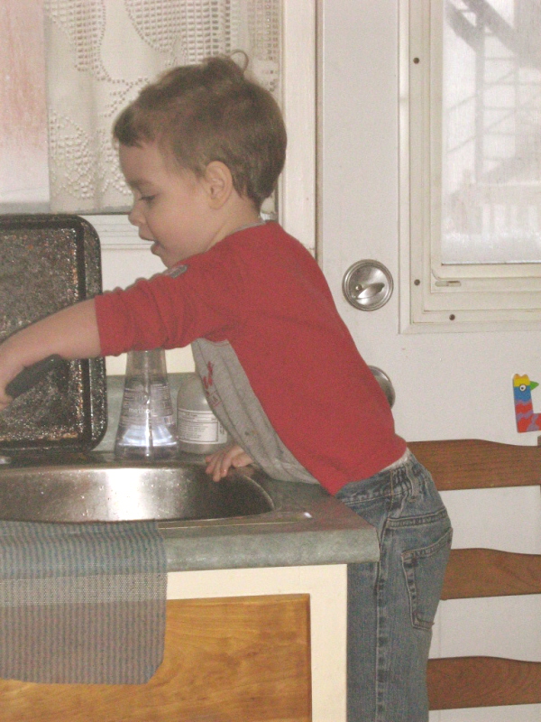 He helps wash the dishes, dragging a chair over and swishing them around in the water. He has also agreed to help feed Gryff, and he carries the bowl of food oh so carefully into the next room. He is much less careful with his bowls of Cheerios. If he asks to help while I’m getting dinner ready I’ll get him to set the table, too.