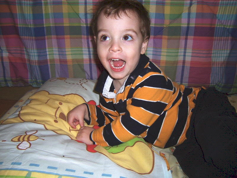Last week he played a game at the caregiver’s where he trotted around the living room, down the hall, around the spare room, then back through the hall to the living room. She asked him what he was doing, and he said, “I’m playing a game!” “What game?” she asked. “The BLUE game!” he said with delight and kept on going. We never found out exactly what the blue game was or what the rules were. It doesn’t really matter. He knew what it was, and that’s what counts.