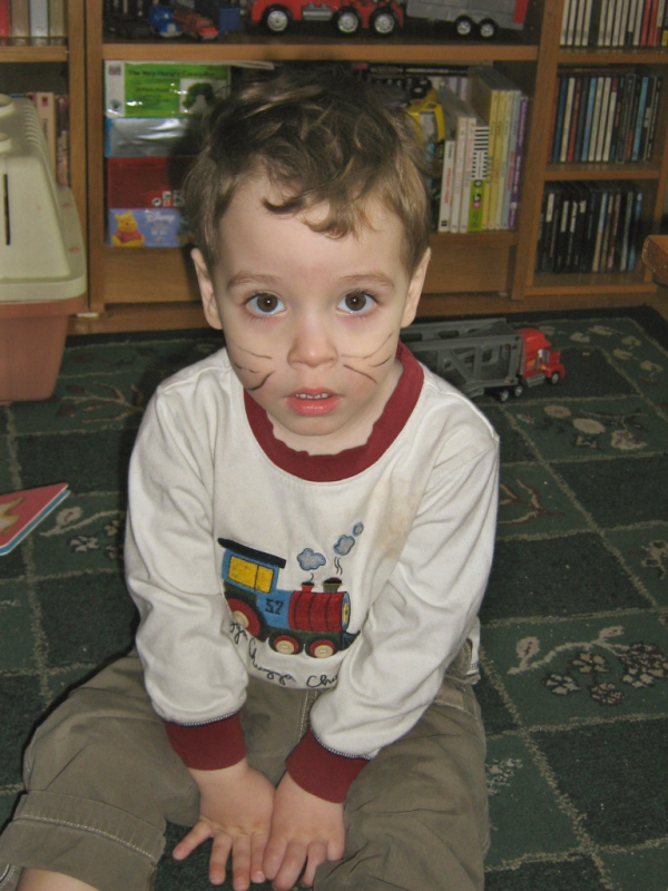 The kid is crazy about the kitten. They play madly with one another, Liam dragging around a string and Gryff pounding after it, or Liam jigging a crumpled up drop card from a magazine tied to a shoelace and the kitten leaping around for it like Nureyev. If the cat’s not in the room, he waves the string around and says in a song-song way, “Gry-yff, I have your stri-ing,” and the cat comes shooting out from wherever he was in the house and launches himself at it while Liam shrieks with laughter. He has to go find the cat every night and pet him or blow him a kiss, depending on where the cat is, before he’ll go to bed. I am so glad that we seem to have succeeded in that particular objective of making sure cat and child get along and bond: the two of them have similar energy levels and keep one another busy.