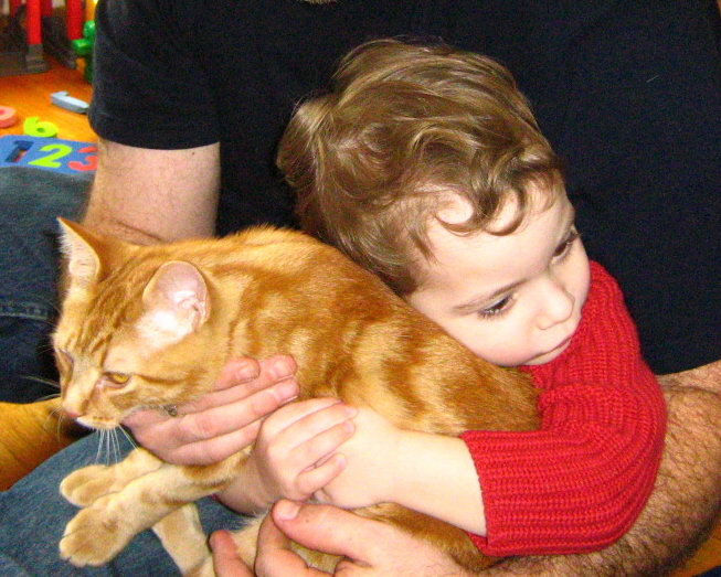 Gryff still sleeps outside his door at night and during naps, and when Liam wakes up some times he lies down on his side of the door and plays with Gryff under it, little fingers and paws darting back and forth. The other day he found Hammy, the old cat toy that had been Gulliver’s special toy. Hammy is the terribly imaginative name we gave to the stuffed hamster with a motor in it; when you pull a string it vibrates. HRH had it on a shelf along with Gully’s old collar. Liam saw it and wanted to hold it, and the moment he discovered the pull string Gryff was there too, grabbing for it. The two of them rolled around on the bed together playing with it, and HRH said that yes, Liam could give it to Gryff to play with. “I think Gully would like that,” he said, watch the two of them laugh and romp with it. Bringing Gryffindor home so Liam could have a cat to play with was one of the best decisions we’ve made for Liam. (I am assuming it’s been a good thing for Gryff too, and judging from the amount of purring that goes on he’s very okay with it all.)