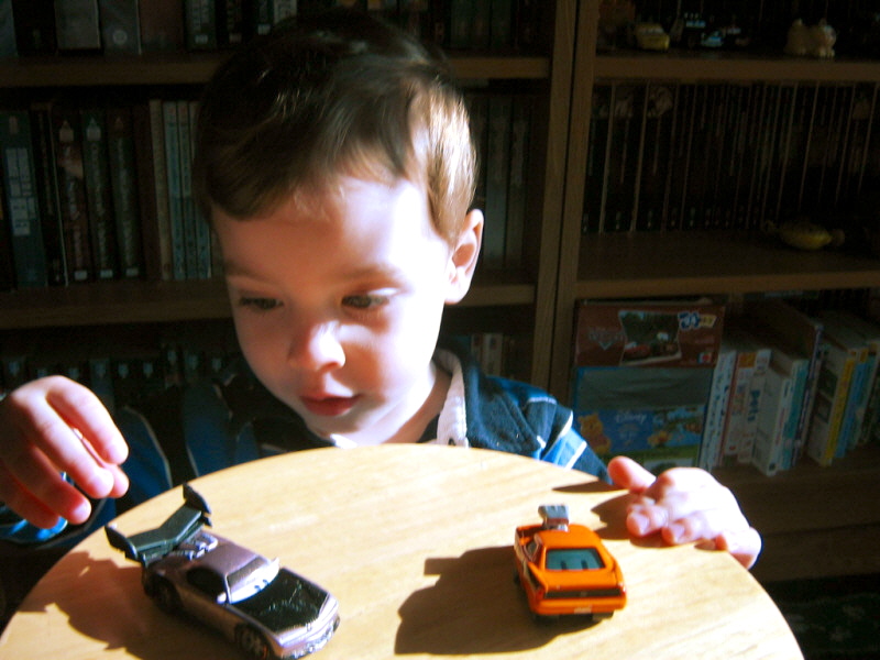Playtime has become quite complicated. His two main toys are his set of metal cars, and his wooden train set. The cars and train have long conversations among themselves, and go through small crises that they solve. It’s very interesting to listen to him. He actively tells us stories at night now, too, instead of us leading him along. It’s a wonderful feeling to walk up the street with him after a day with the caregiver and ask, “So did you have a good day? What did you do?” and listen to him chatter on about what he did, and to understand it all.