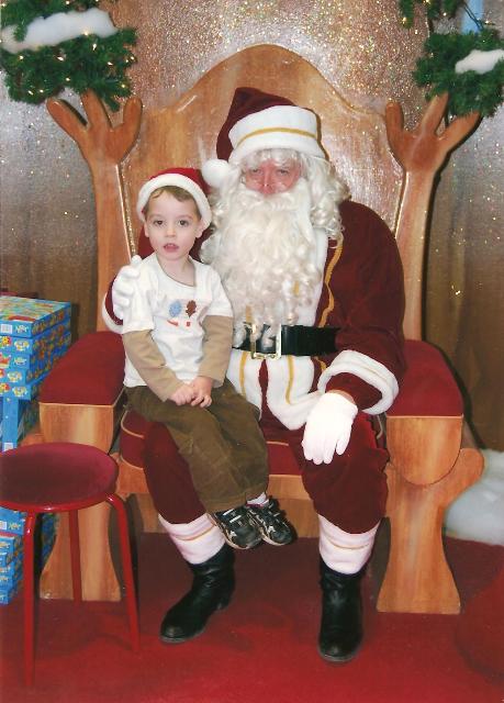 Saturday dawned bright and cold. We went to the mall and got the boy out of his snowsuit and boots, and into his shoes. We waited in a very short line for Santa, who was wonderful. Liam found his little Santa hat this morning and tucked it into the tote bag we brought with us, saying that he was going to be Santa’s helper when he got there. He put it on just before he got his turn with the Santa, and told him (rather shyly, for some reason, we aren’t sure what happened to the exuberant kid who’d been waiting in line) that he wanted a train. “A train? Like a Thomas train?” said Santa. And the boy turned huge eyes upon him, as if to say, You *do* know everything!