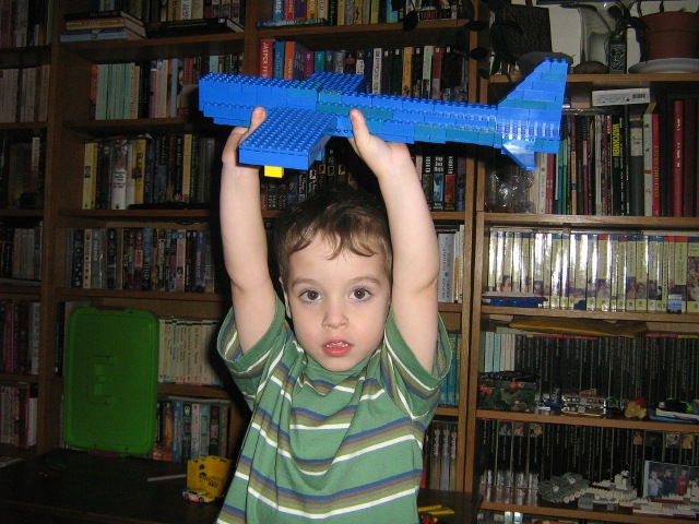 The biggest new experience this month was without question riding the metro, or the ‘underground train’ as he calls it. He loved watching from the platform for the lights coming down the tunnel, watching the trains passing in the other direction, looking at the art in the stations while people got off and on; the entire experience was exciting. I’ll be taking him with me to a downtown meeting next week just so he can have another ride. The other exciting new thing is the Lego Star Wars game we bought for the Xbox, which he just adores. He figured out how to make the characters run around, jump, and attack in no time at all. Playing in co-op mode is a bit of a challenge because he’s likely to run off in the opposite direction, and the characters are yoked within a certain distance, but he’ll get better. This month’s awesome new film was Bolt.
