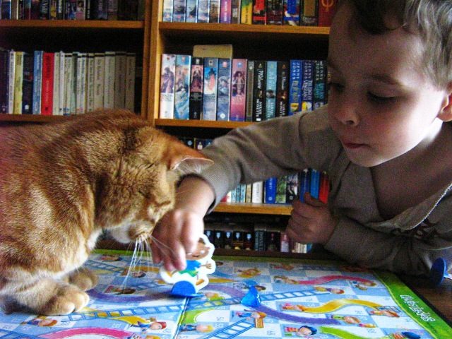The other big milestones this past month were the purchase of his first board game, Chutes & Ladders (apparently Snakes & Ladders, the UK version, is no longer available in Canada and thus we ended up with the rather preachy US one, hmph), and the purchase of his first set of gaming dice. He is very enthusiastic about Chutes & Ladders, only he thinks the chutes are preferable because in the playground doesn’t one climb a ladder to get to the more exciting slide part? And he chose a d20 from his new dice to roll for his first game, which made it rather short. (His next pick was a d4, which meant the second game was abandoned after taking forever to get anywhere.) So we are working through the inevitable tears when someone else wins (“But I wanted to win!”), and the concept of luck and random dice rolls, and the idea that it isn’t the end of the world if someone else wins; we just set the board up again and start anew. It’s the fun we have playing that counts.