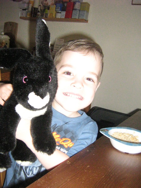 The newest addition to the household is stuffed black rabbit with white paws, whom the boy saw on a post-Easter shelf at the drugstore we stopped at on the way out of Oakville. He instantly fell in love with him, and as it was half-price, I bought it for him. “What are you going to call him?” I asked on the way to the car. “His name is Blackie-Whitie,” Liam said with confidence. And he hasn’t put the darn thing down since that day. He’ll go all shy with people when they talk to him, but he’ll hold out the rabbit and say, “This is my new bunny, his name is Blackie-Whitie.” Sometimes he adds, “His nickname is Blackie,” just so everyone’s clear. Starting in the car on the way home from Easter, he has been saying, “Mama, you can cuddle Bun-Bun” and pushing Bun-Bun at me till I take him in the crook of my arm. We suspect he doesn’t want to hurt Bun-Bun’s feelings, which is very sensitive of him. Otherwise he drags Blackie, Bun-Bun, and the little white rabbit he called Peter until he got another tiny white bunny called Snowball/Blizzard, so the first white one is alternately Peter/Blizzard/Snowball, depending on what the tiny one is called that day) around in his arms at home, and negotiates bringing all three or five along for car rides. (One. He is allowed only one.) Blackie is now somewhat bedraggled. I mourn his silky clean fur.