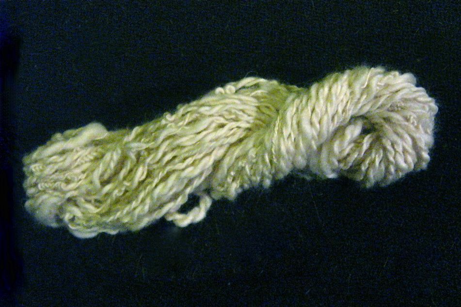 And here is my first-ever baby skein of yarn plied from a single spun on a wheel. The length of the finished skein is about eight inches.