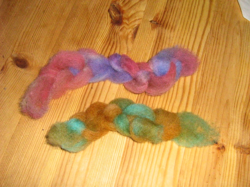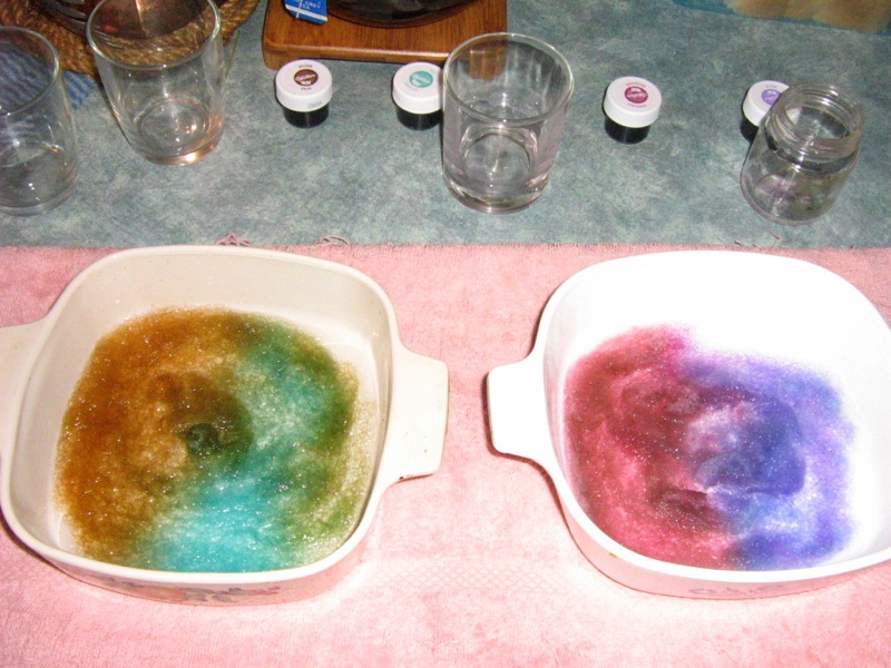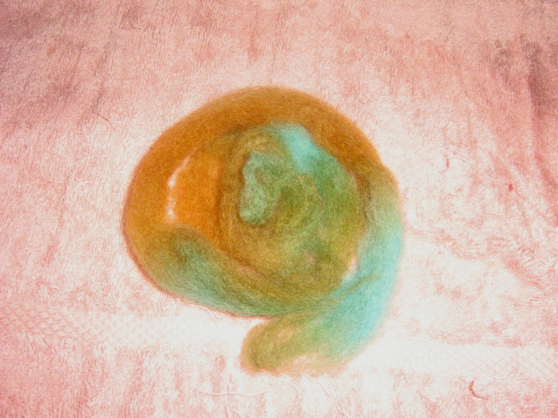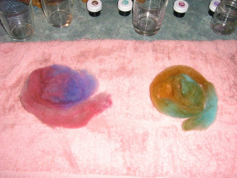 I forgot to take Before pictures of the fibre in the freshly poured dye, but just imagine the colours you see in the glasses poured onto a faintly off-white fibre. Here’s the brown/teal, after its first trip to the microwave.