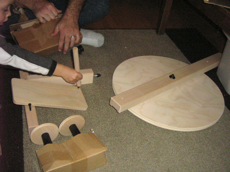 Once home, we ate (this was very, very hard for the boy, despite having picked up chicken and fries from his favourite restaurant, St. Hubert, on the way home from Ariadne, because he was so incredibly excited about the wheel) and then adjourned to the living room to unpack the boxes.