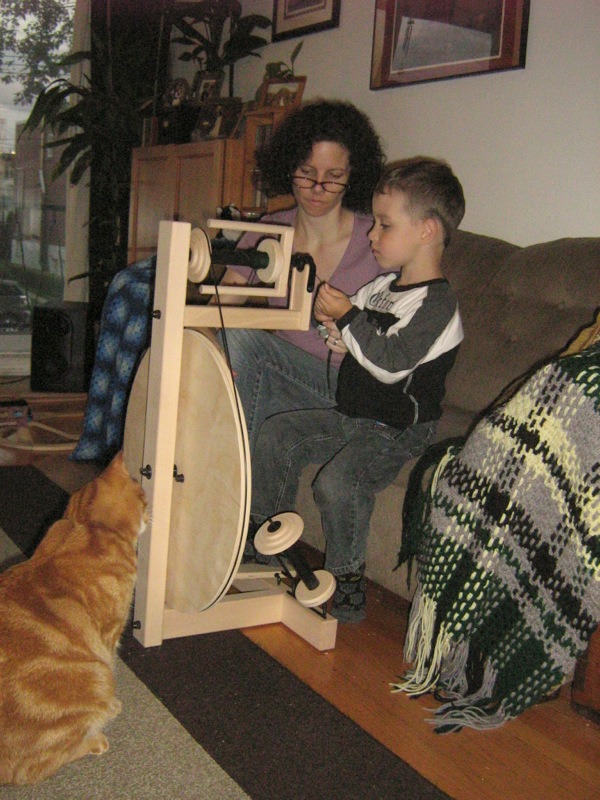 I spun a tiny handful of test fibre for a moment or two (and got a very respectable thin though slightly uneven yarn, yay me), but the boy was bursting to try. I got a ball of acrylic from the closet and tied it on for him so he could practice treadling (he’s not really there yet, even with me helping) and maintaining the tension on the fibre in his hands. He “spun” up a bunch, then I put the skeinwinder on the wheel (not shown here), wound it off for him, then showed him how to twist it into a skein, with which he was absolutely delighted because it was “his yarn that he had spun”. As you can see, Gryffindor is fascinated with the flywheel. There’s a black knob on the back of the disc that caps the bit you snap the footman on to, and he was watching it go round and round.