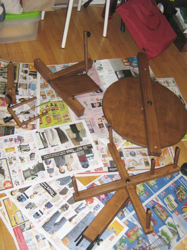Once he was in bed I took the wheel apart and began staining it. (For reference purposes, I used Varathane Gel Stain in Early American, no. 466, and I adore the colour; it’s almost exactly what I wanted. I would have preferred something a tad lighter, but the next lighter colours were much too gold or red for my taste, and besides, this will lighten slightly over time with exposure to sunlight.) The wood didn’t even need a sanding; all I had to do was wipe it down with a bit of flannel. It did soak up stain, but not to such an extent that the colour went irreversibly dark immediately. After I finished staining each piece I wiped off the excess and evened it out. It only took about an hour, and then I left it to dry overnight.