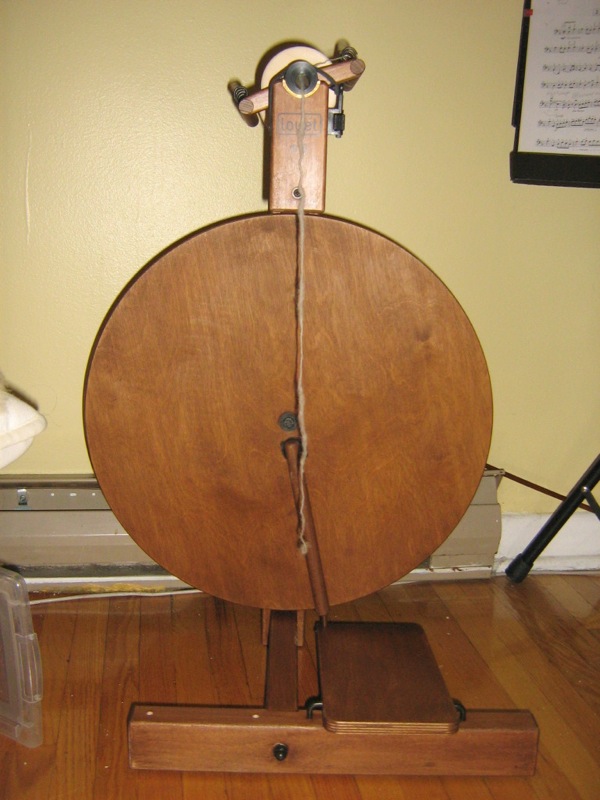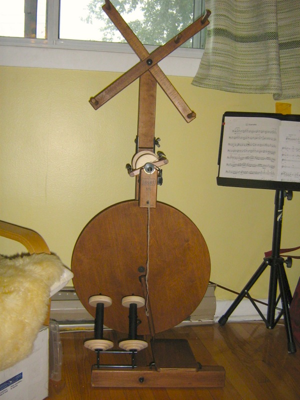 It’s so attractive! Totally modern, yes, but it has such a friendly look to it, whereas I must admit that I find some of the older spinning wheels rather creepy (perhaps in part because of my childhood fears of the witch with her stabby spinning wheel in some versions of Sleeping Beauty). And the stain makes it even homier.