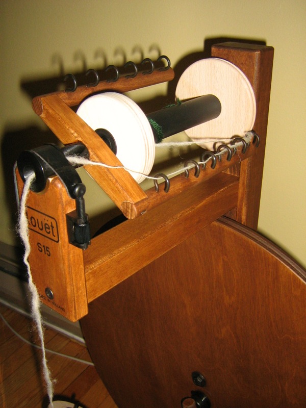 It’s a very modern-looking wheel, but I’m very all right with that. I wanted something with a small footprint, which meant an upright instead of a Saxony, and I wanted something I was comfortable with that was low-maintenance, didn’t require much adjustment, and could be easily serviced in case of problems. My LYS is a Louet dealer, and I worked with their Louet and was very happy with it. It’s remarkably light and not awkward at all to carry, which means that I can move it from the living room and back to my office when I want to, or even to the back deck in the summer. It will travel very well in the boot of the car on its back on a blanket. (Although I hear that many Louet spinners buckled their wheels into a seat in the car, which would also work.) I couldn’t do that with a Saxony. I’m also not afraid to knock this one about a bit; if I had a nicer traditional-looking wheel I’d be worried about it all the time. Louets are workhorses and go on forever, judging from the enthusiastic following they have in the spinning community. When I have room, and when I am better at this, and when there is extra money, perhaps I shall look into getting a Saxony as well. That’s far in the future, however. I have my wheel; I am content.