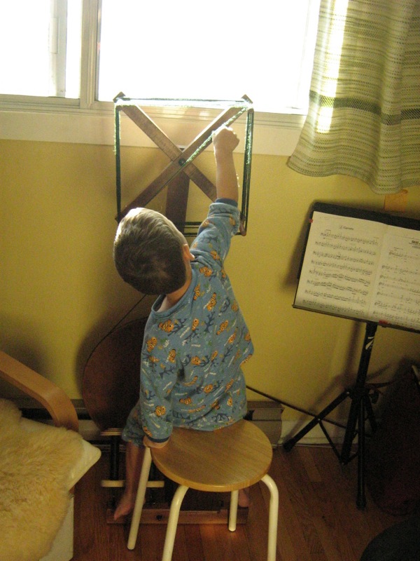 Reading: he knows more than he’s letting on. This is frustrating for us. I understand that he doesn’t want to lose the closeness of an activity like reading together, but nothing we say or do seems to convince him that we’ll keep reading to him if he admits that he can read on his own. His language skills are noticeably developing more and more. His inflections and sense of humour are really emerging. He’s starting to engage in wordplay, which is hilarious. There are a lot of “Why did the chicken cross the road?” jokes going on, which are funny because they’re not funny, if you know what I mean. ( “Because his knitting was on the other side!” will kill your audience because you’ve missed the point of the joke.)