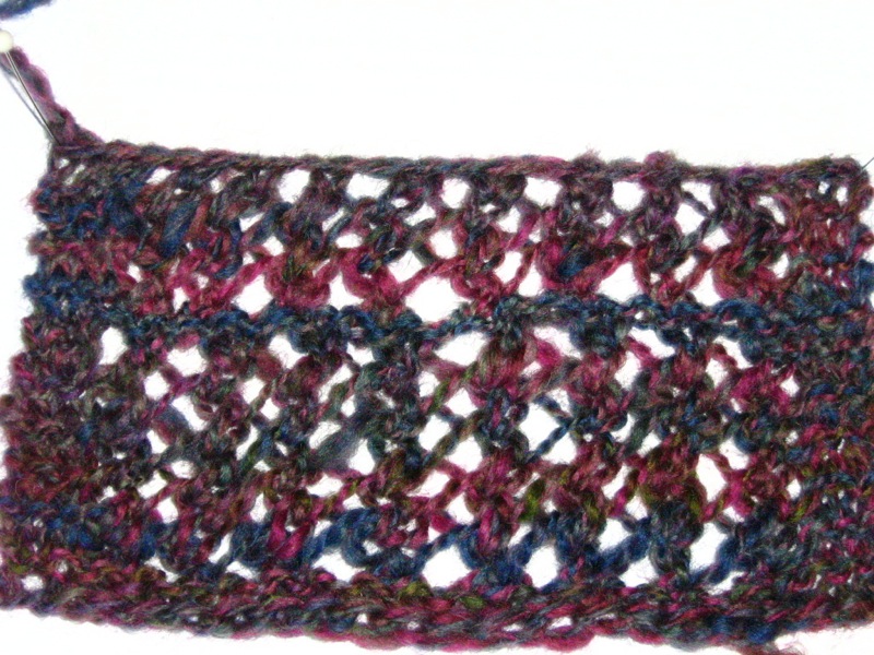 One and a half repeats, half-width swatch of the pattern for my eldest goddaughter’s Yule gift, a convertible wrap/scarf/capelet/hood, knit with the two-ply sample of my own handspun yarn: