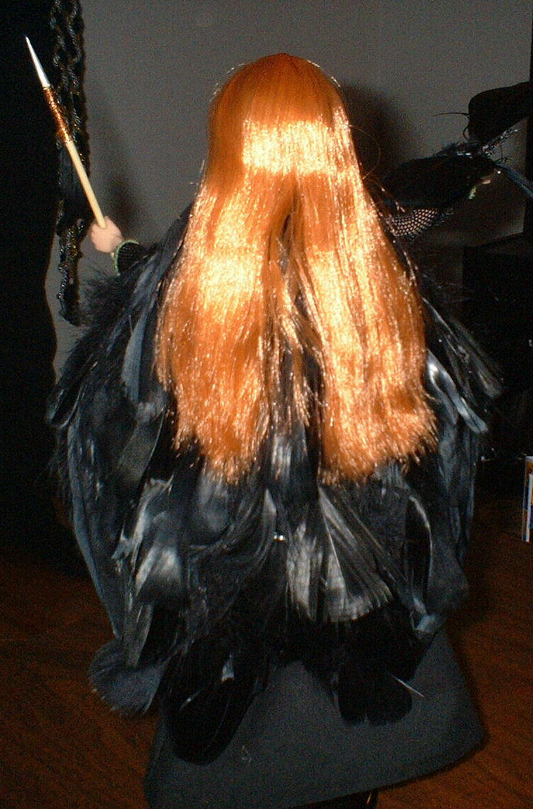 I was really pleased with how the whole doll presents an air of alert motion and activity. For any OOAK fans who stumble across this post as a result of a search engine and who need to know, the Morrighan was created from a Kayla Secret Spells doll, and her face was not repainted: I managed to find one off the shelf who had a perfect disdainful yet amused I-can-see-into-your-soul look on her face that I wanted, without any touch-ups required.