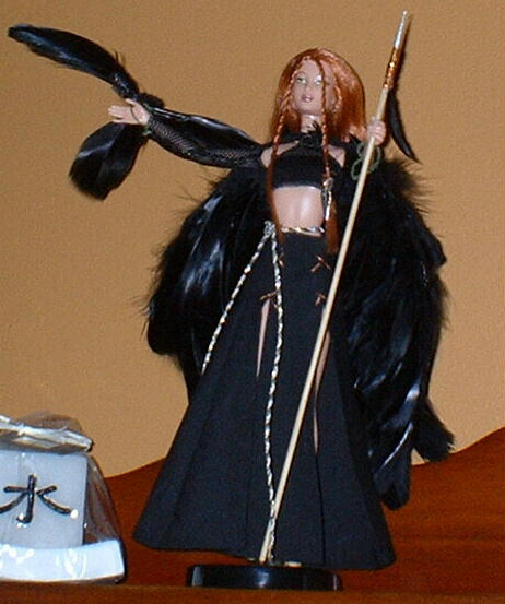 The OOAK Morrighan Barbie wears a hand-made black linen skirt with two full-length slits in the front, laced shut at the front of the hips with copper floss. Her hand-dyed black halter top with mesh sleeves ties at the back. Woven into her left front braid is a pewter feather; another pewter feather is laced with copper floss to her hand-painted spear, along with a black crow feather. On her right hand lands a hand-made raven, wings held wide. Around her waist is tied a hand-tinted miniature of the recipient’s Craft tradition third-degree cords.