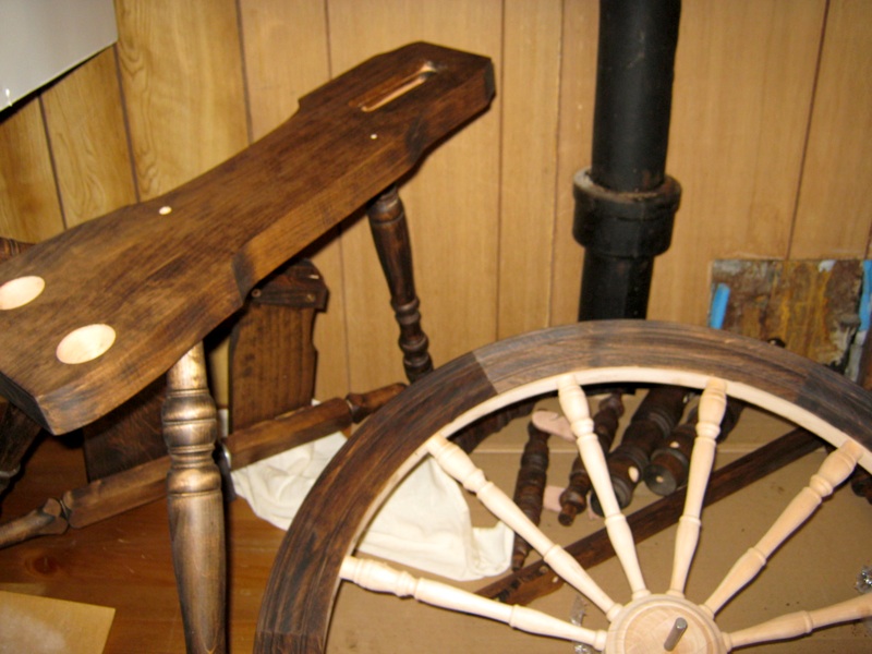 The spinning wheel got its second coat of stain this weekend. I chose a warm gold to put over the cool dark walnut, and it’s perfect; it came out exactly that shade I wanted it to. I’d give you a picture, but I can’t seem to take one that looks any different from the first one, although they look very different in real life. I was going to wax it last night, but I opened the tin of furniture paste wax HRH had brought home from work and slammed it shut again immediately. It stank. There was no way I was going to breathe that while I waxed all the fiddly stuff, nor did I want any hint of that chemical smell clinging to the wheel. So I’m currently searching for a non-petroleum-based wax. My mother tells me she uses Brimax, so I’m looking for that. There’s a distributor in Pointe-Claire, but I don’t know if they sell direct to retail customers; I’ll have to call and ask later this week. Etsy lists a few handmade organic beeswax- and carnuba-based polishes with either lemon, orange, or lavender oil in them, so I may order one of those. I could always concoct one myself, too; there are enough recipes out there. I’d have to find the ingredients first, of course.