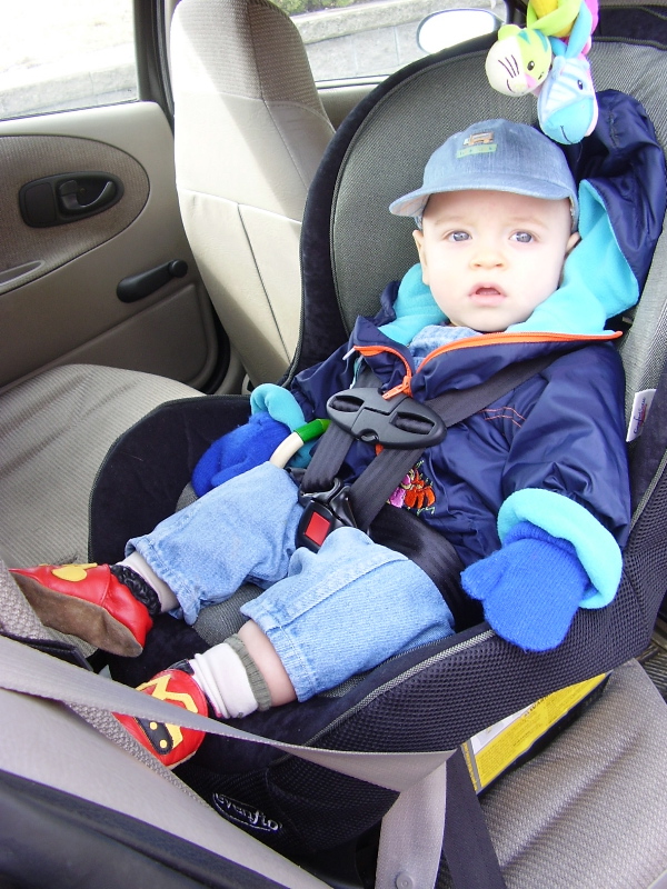 Here is Liam, in his new hat, his new coat, his new shoes, and sitting in his brand-new car seat!