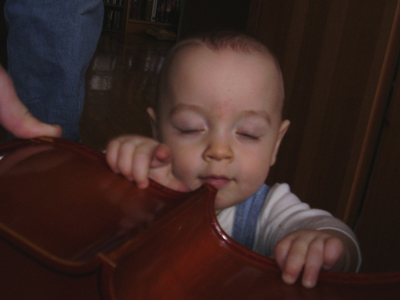 Liam loves his Mama's cello. When I set it up one night and played it in front of him for the first time, oh, he wanted it badly (as in a lunging off Da's lap with his arms outstretched towards the instrument kind of badly). After playing it for him I laid it on the floor on its side then sat him down next to it, and he knew exactly what to do: he lifted his hands and let them drop over the strings, strumming them with both hands. Then he held them down with his right hand and strummed with his left. Sharp kid.