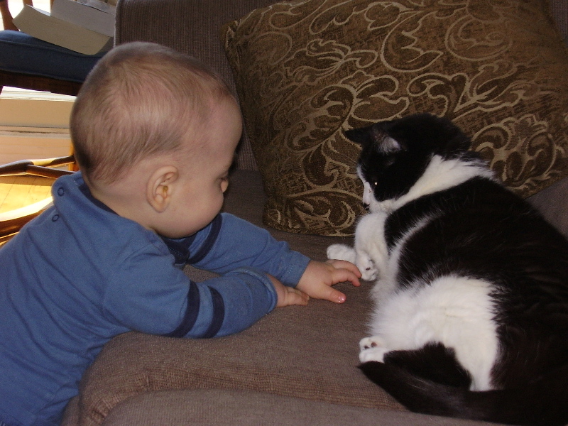 Maggie lets Liam hold blocks up in her face, pull her, kiss her, pat her, and bury his face in her. The one thing she won't let him do (apart from bite the tip of her tail!) is touch her feet. When he reaches for them, she pulls them firmly out of his reach and looks at him sternly.
